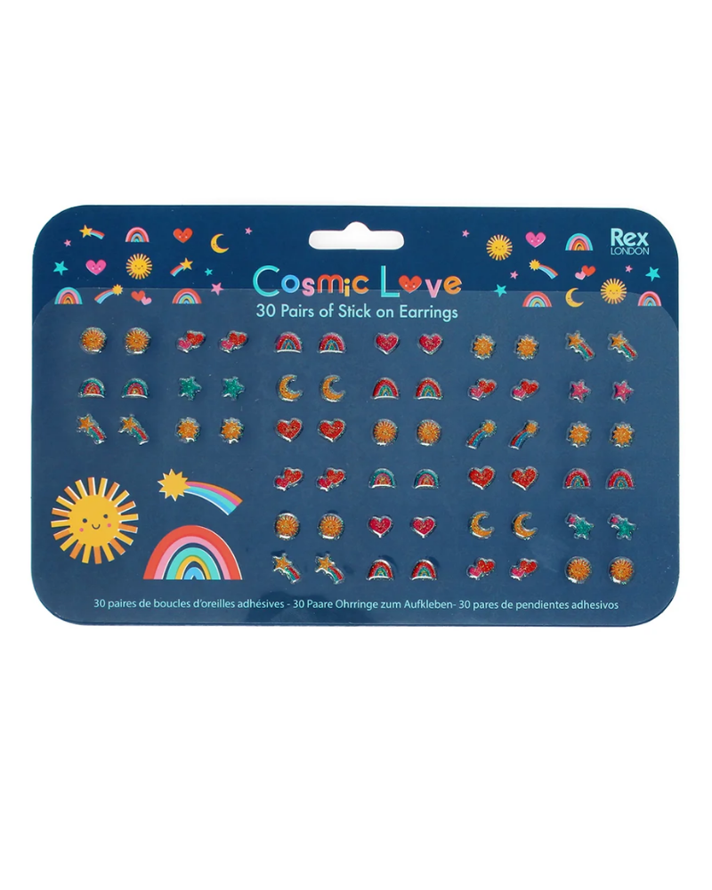 Make a cosmic statement with the set of 30 Cosmic Love Stick on Earrings! These playful earrings feature stars, rainbows, and a sun. Perfect for children and the young at heart. Shine bright and spread love with these quirky stick on earrings!