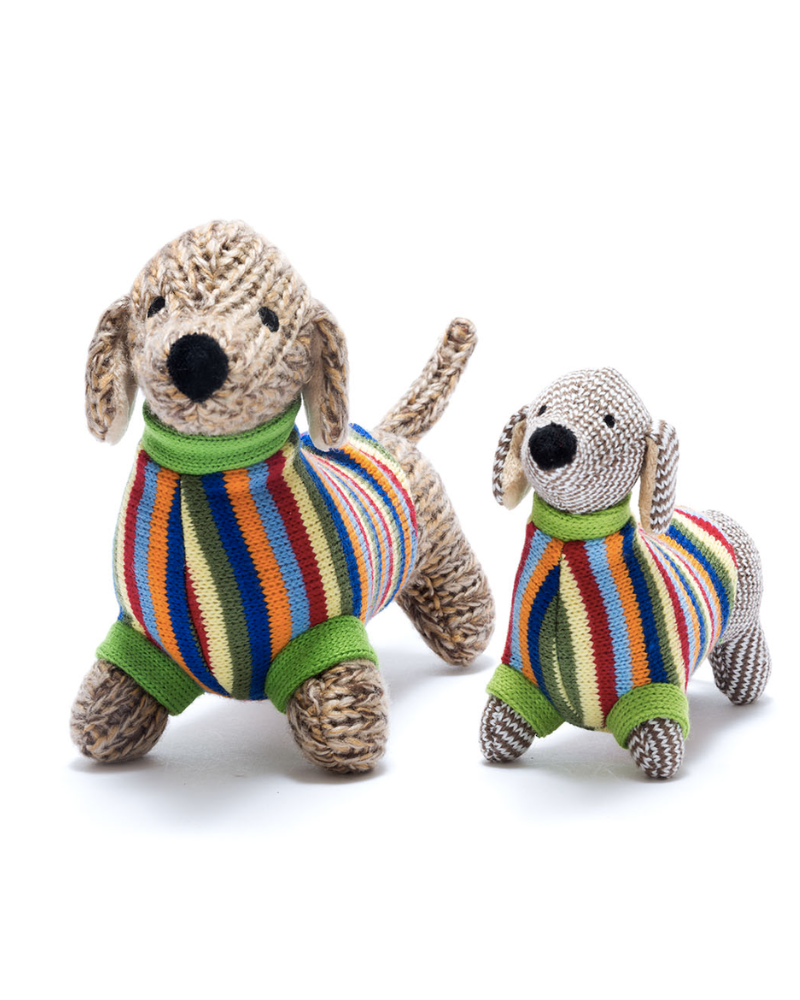 Knitted sausage doy toy sporting a dashing rainbow striped jumper. A perfect gift for a dog lover.