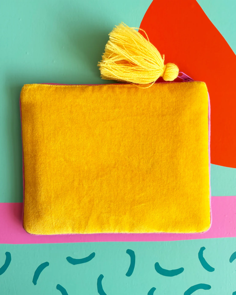 Carry your essentials with bold attitude in this cotton and velvet purse from the Doghouse collection. Featuring three funky dogs in vibrant colours across the front, it’s finished with the unapologetic slogan “Dogs Before Dicks” - we can relate! Soft to the touch and the perfect size for your bits and bobs, this purse is for anyone who knows where their loyalties lie—and isn’t afraid to say it loud.