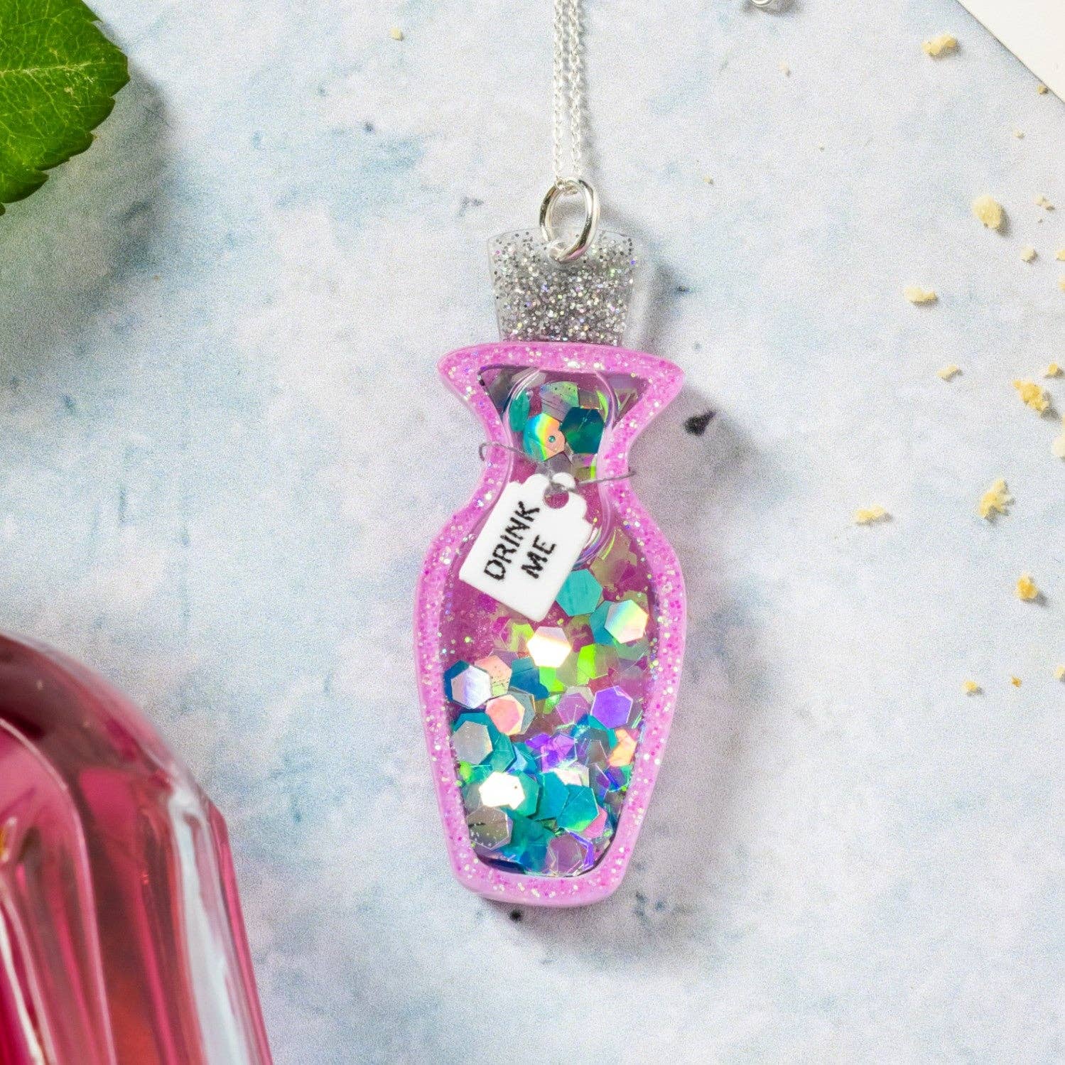 This drink me pendant is super quirky and fun. Sure to be a talking point. This is made with real liquid inside.