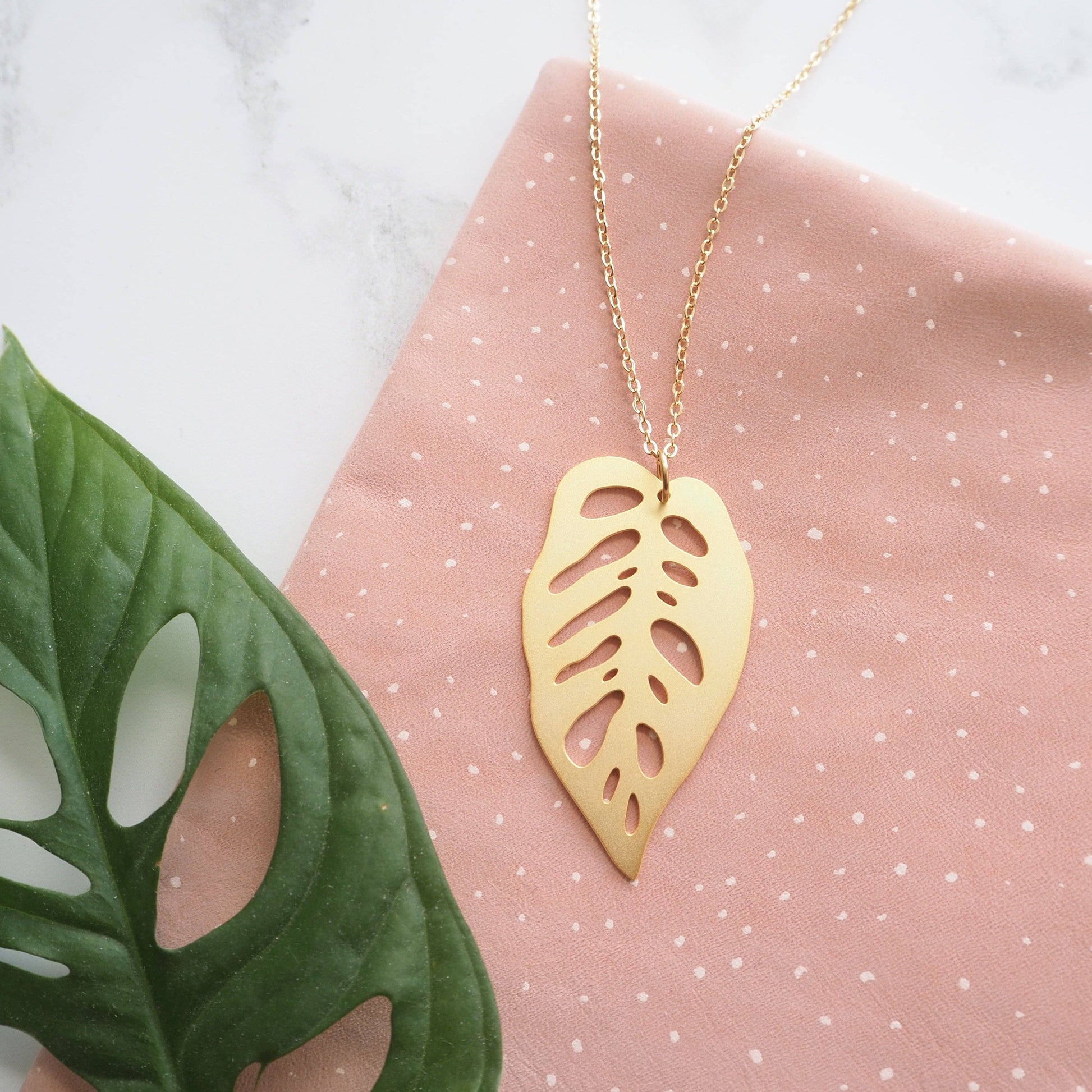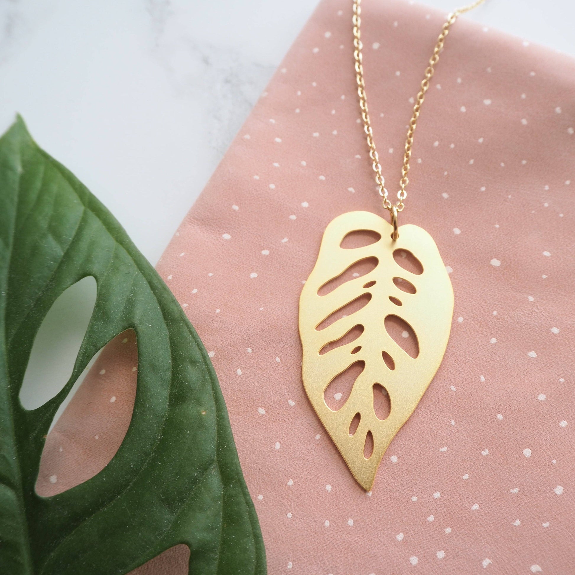 Gold Monstera Obliqua House Plant Necklace.
