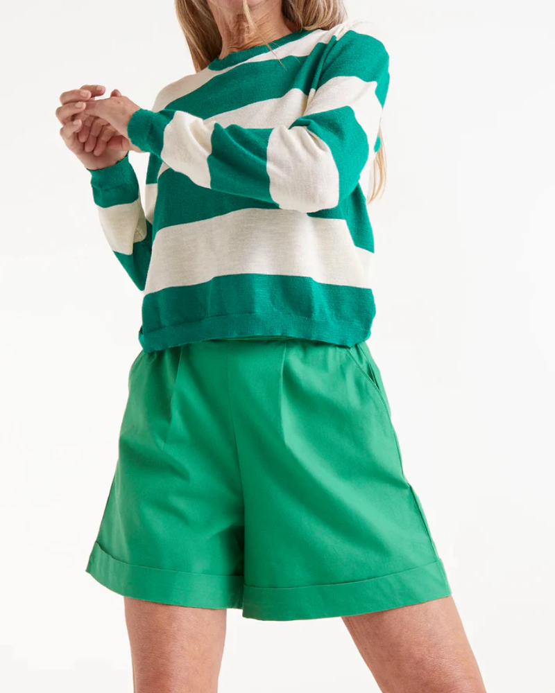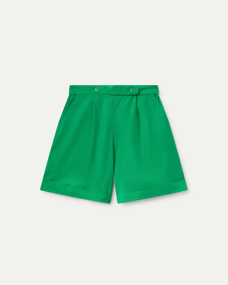 Fixed front waist, elastic back waist, straight leg, side pockets, button detail at waist.
