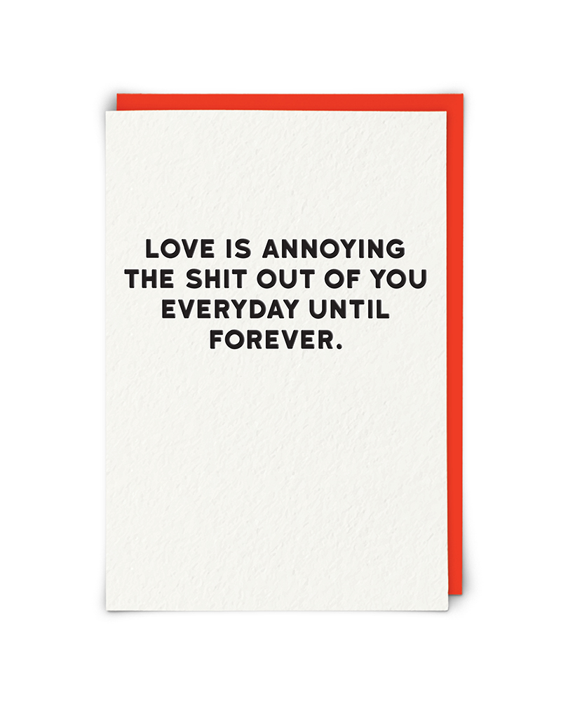 Love is an amazing feeling.... but so is being a nuisance! The Love is Annoying You Greeting Card is the most realistic card you can get for the special someone in your life. Perfect for anniversaries or Valentine's Day, spread some cheeky cheer that counts!