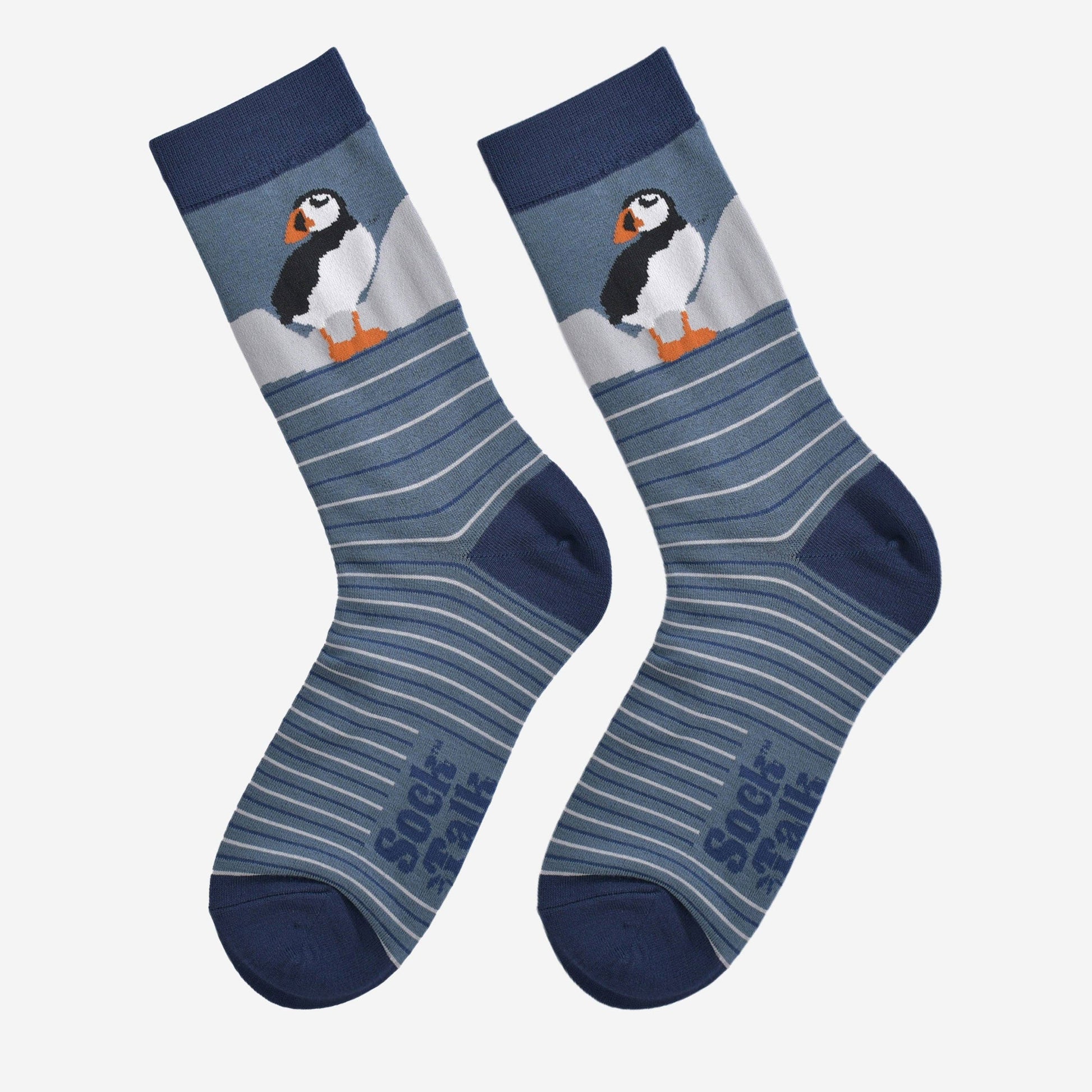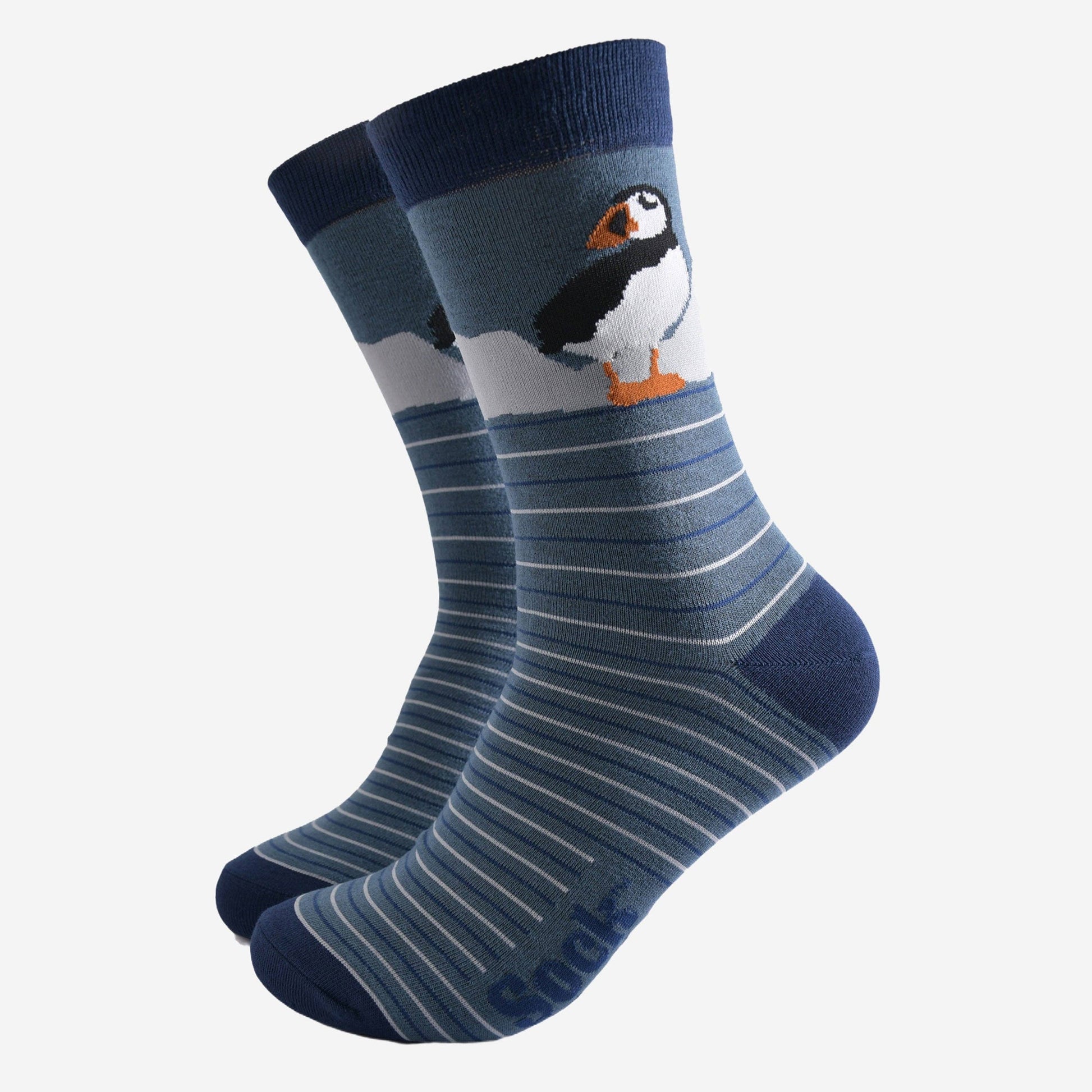Soft to the touch luxury bamboo socks featuring puffins. In a classic teal with a contrasting navy blue cuff, heel and toe. These striped socks are designed in the UK and crafted from soft eco-friendly bamboo.