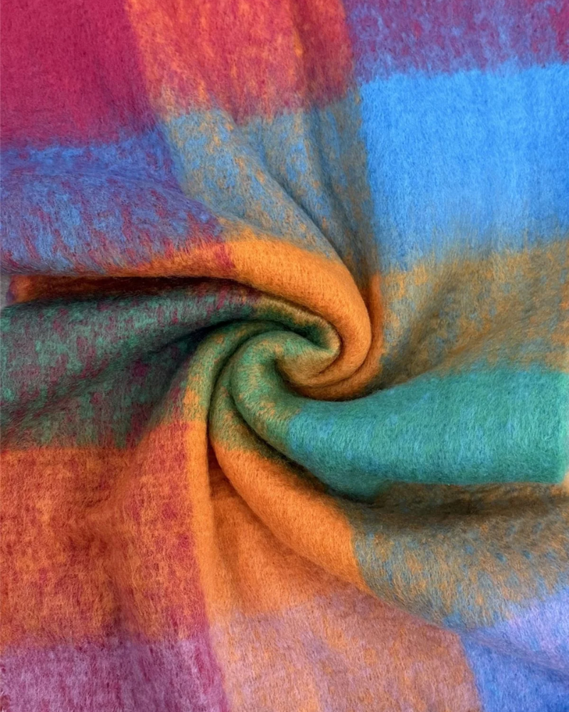 A Wool Checked Blanket Scarf in shades of magenta, orange and blue.