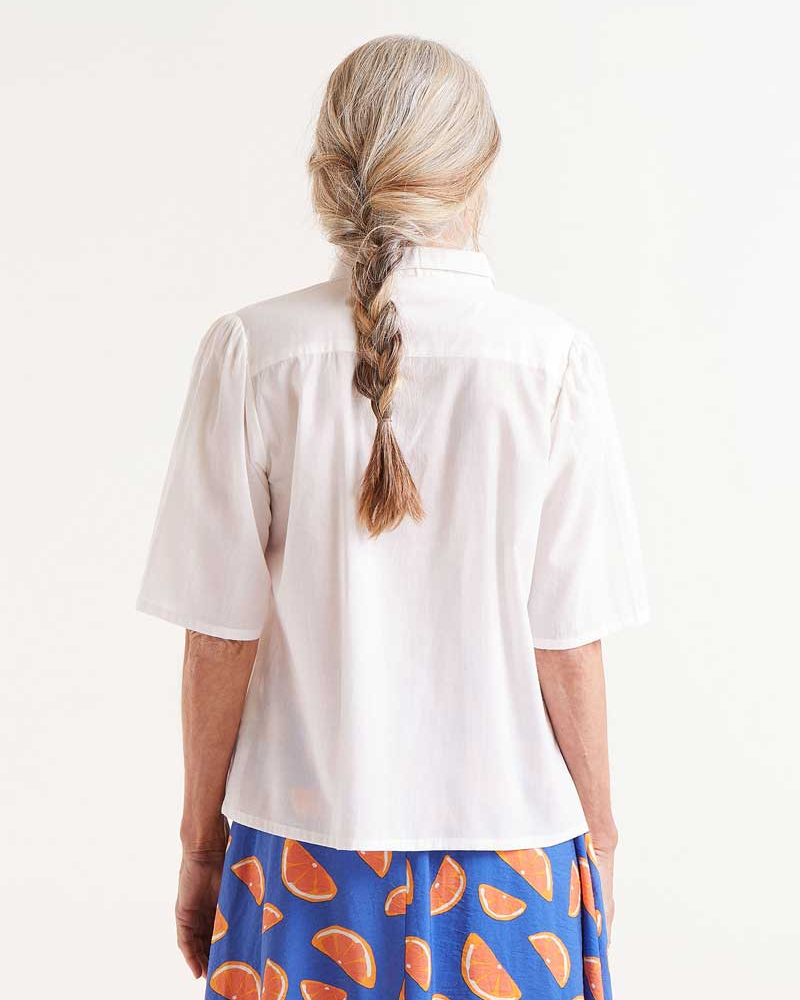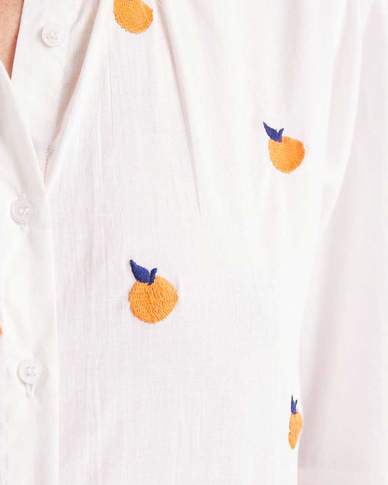 Embroidered oranges print, front button closure, lapel collar, short puff sleeves.