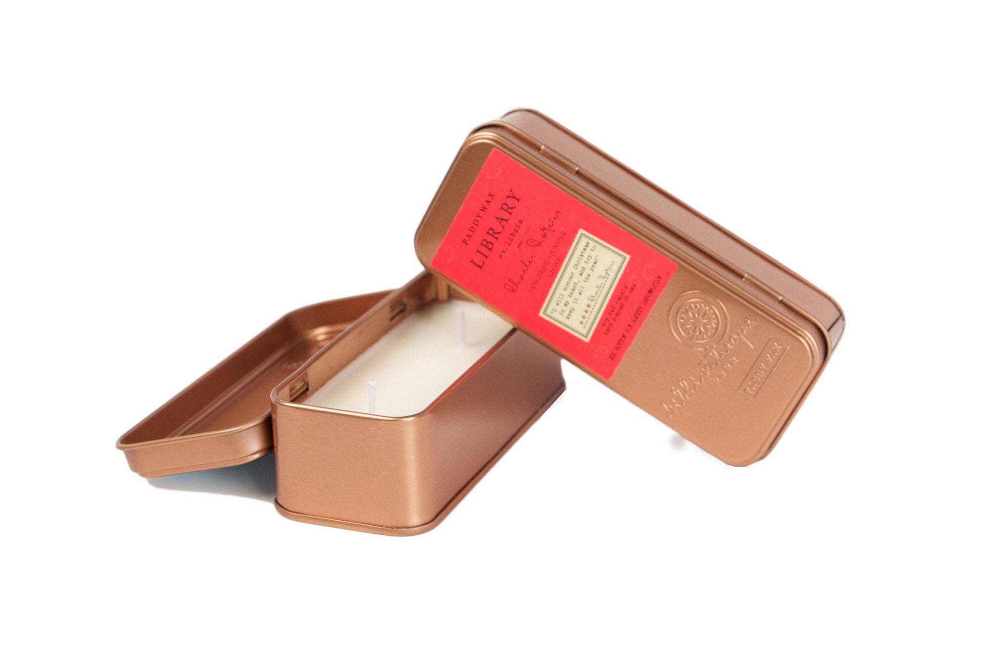 Charles Dickens inspired, Paddywax Library Two Wick Travel Tin. For all the bibliophiles in our lives we present the Library Collection. Pairing favourite quotes with exquisite fragrances, we pay homage to the literary greats.
