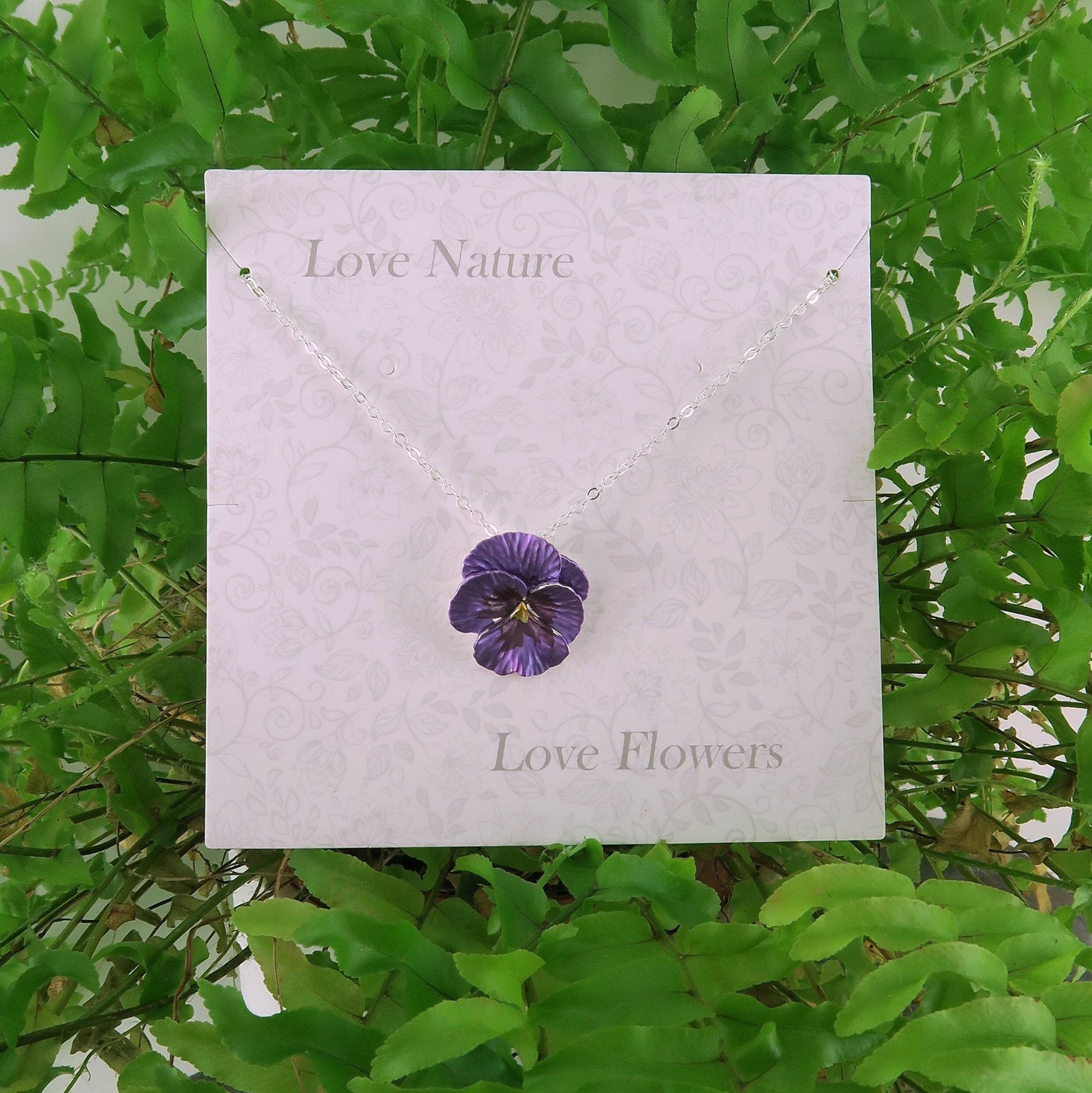 Pansy purple hand enamelled silver plated pendant. The pansy flower represents the birth month of February, love, consideration, free thinking and makes a special gift.