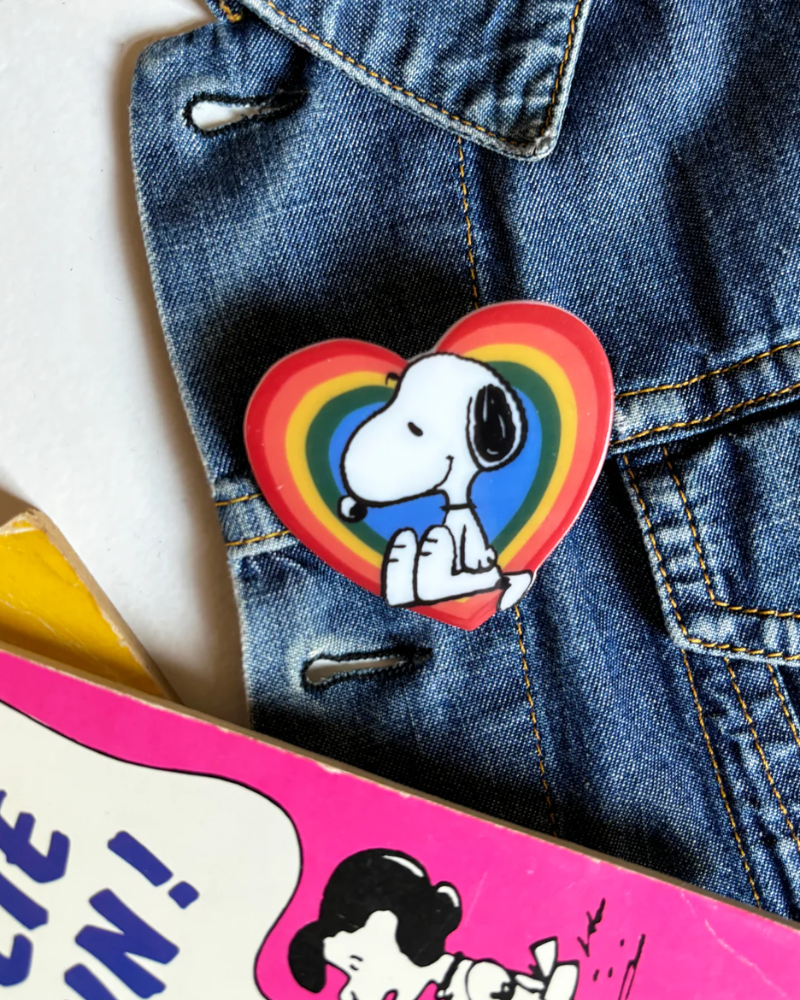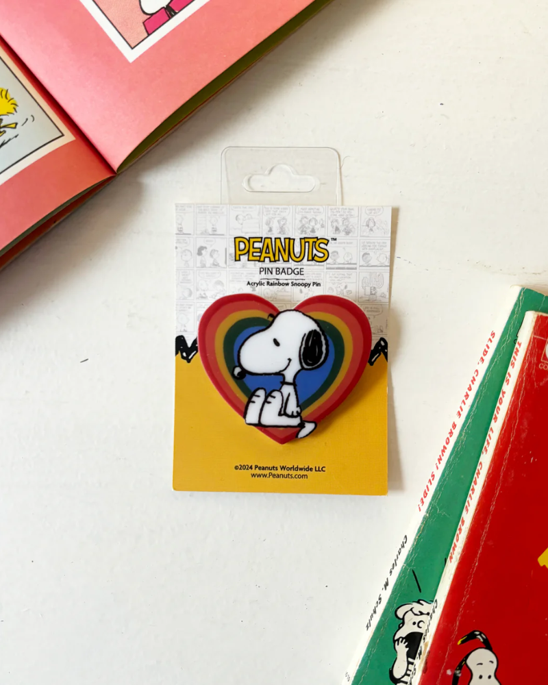 Go pea-NUTS over this Peanuts Snoopy Rainbow Pin Badge! Wear your heart on your lapel, and show some love for all the Peanuts gang.
