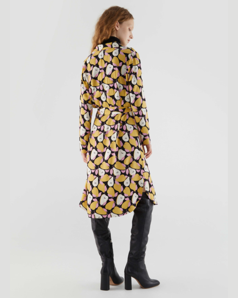 Midi shirt dress in viscose twill with pear print. With lapel collar and long sleeves. Front button closure and belt. The model is 173 cm tall and wears a size S.