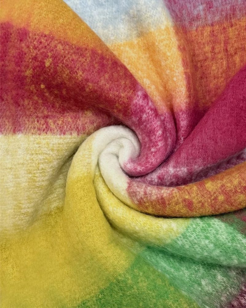 A Wool Checked Blanket Scarf in shades of magenta, white and mustard.