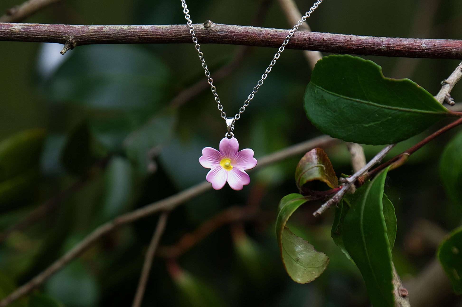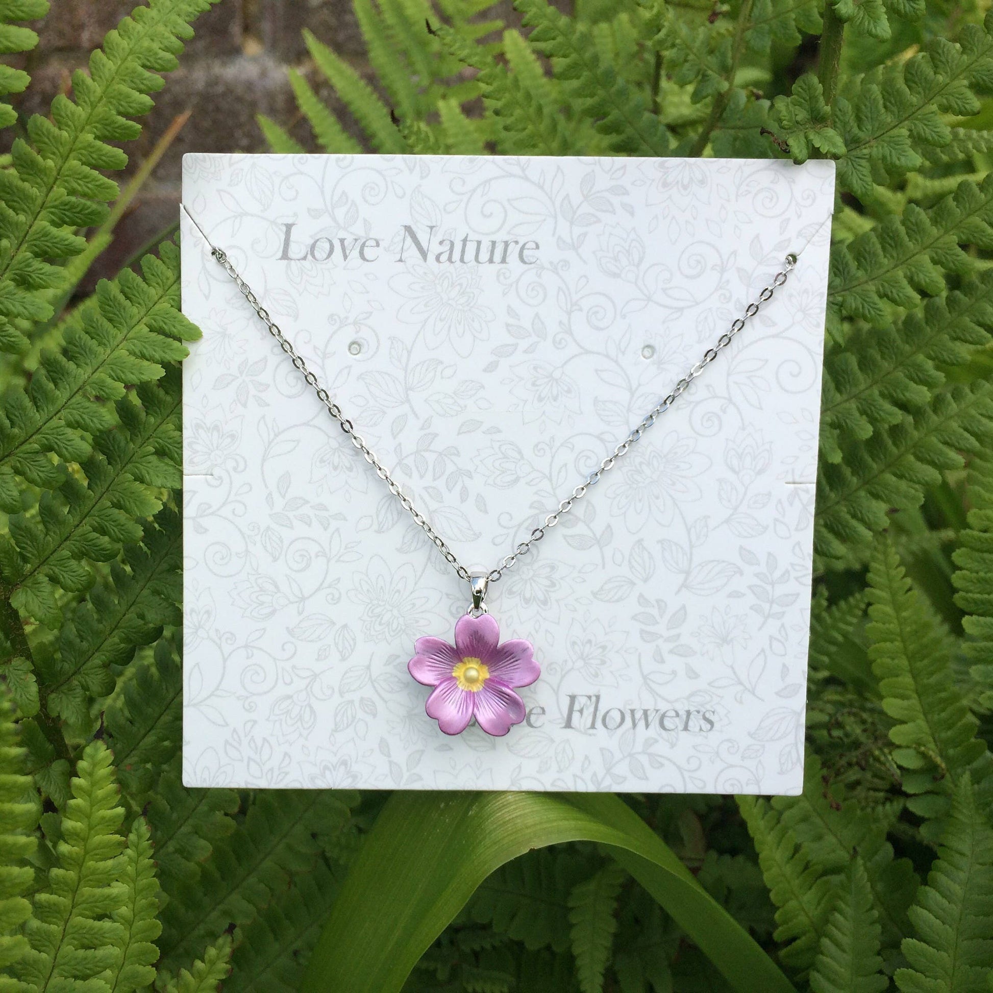 Primrose pink hand enamelled rhodium finished pendant. The primrose flower represents young love and makes a special gift.