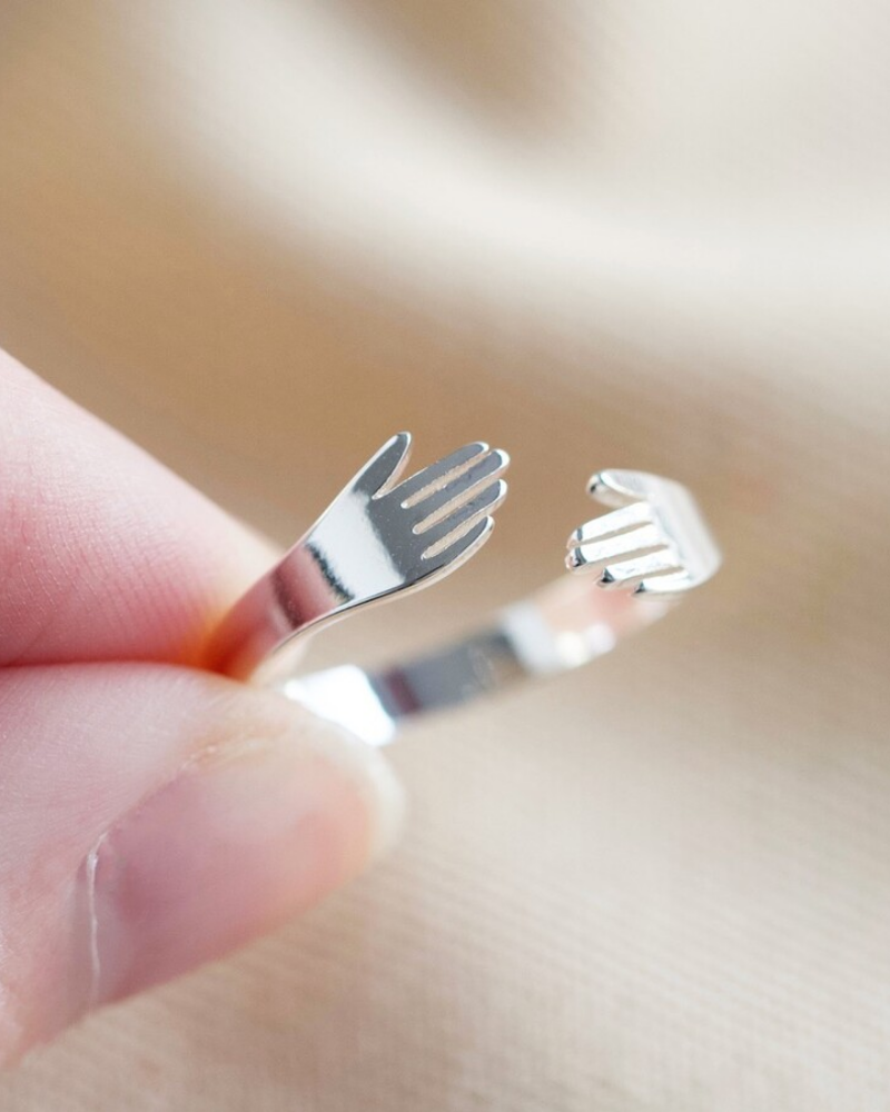 In a time when hugging hasn't quite been happening, this adorable hug ring is a must! Formed of a curved band with tiny hands on each end that hug around your finger. Perfect for a gift!